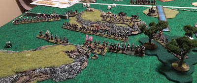 My maneuvering on the left was good, but some cagey card play by Bruce and crap dice meant I got thrown back multiple times when I charged the hill.